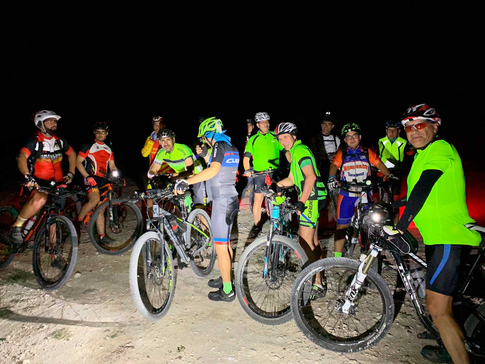 Y fuimos equipo, y esa unión deslumbró, como un faro en la noche. Paco, nuestro querido Paco, llevaba días preparando una salida nocturna, es bien sabido lo que le gusta a este hombre salir de noche , bueno, eso y las sendas. Tras preparar la equipación, las luces, la bici (la había tenido en el taller sólo un par de días antes) y despedirme de mi familia con un beso y un “hasta luego”, no sin los reproches y preocupación de mi mujer, advirtiéndome para que tuviera cuidado ya que de noche todos los gatos son pardos, arranqué al lugar de la cita, la fuente de la Junquera, a las nueve. Me sorprendió gratamente ver allí , sentado, esperando a José Luis, lider y alma mater de los Finishers. Tras saludarnos comenzó a llegar más gente. Enseguida , uno tras otro, David acudió con dos amigos suyos, que si bien eran nuevos en nuestras filas no presentaban pinta de “novatos” no se si me explico, Morata, Carmelo, Enrique, Andrés, nuestra joven promesa y , según sus deseos, futuro Guardia Civil, Paco Ines, David , el que tuvo una lesión en su pierna pero ya recuperado más que de sobras y así hasta un sinfín. Enseguida me di cuenta que en el sitio se hallaban mas Finishers que del resto, esto trajo a mi cierta preocupación, ya se lo fuertes que están los condenados. Esto unido a que no conocía el recorrido de esta ruta produjo en mi cierta sombra pero , como digo, nada importante cuando las ganas y la buena voluntad se juntan.