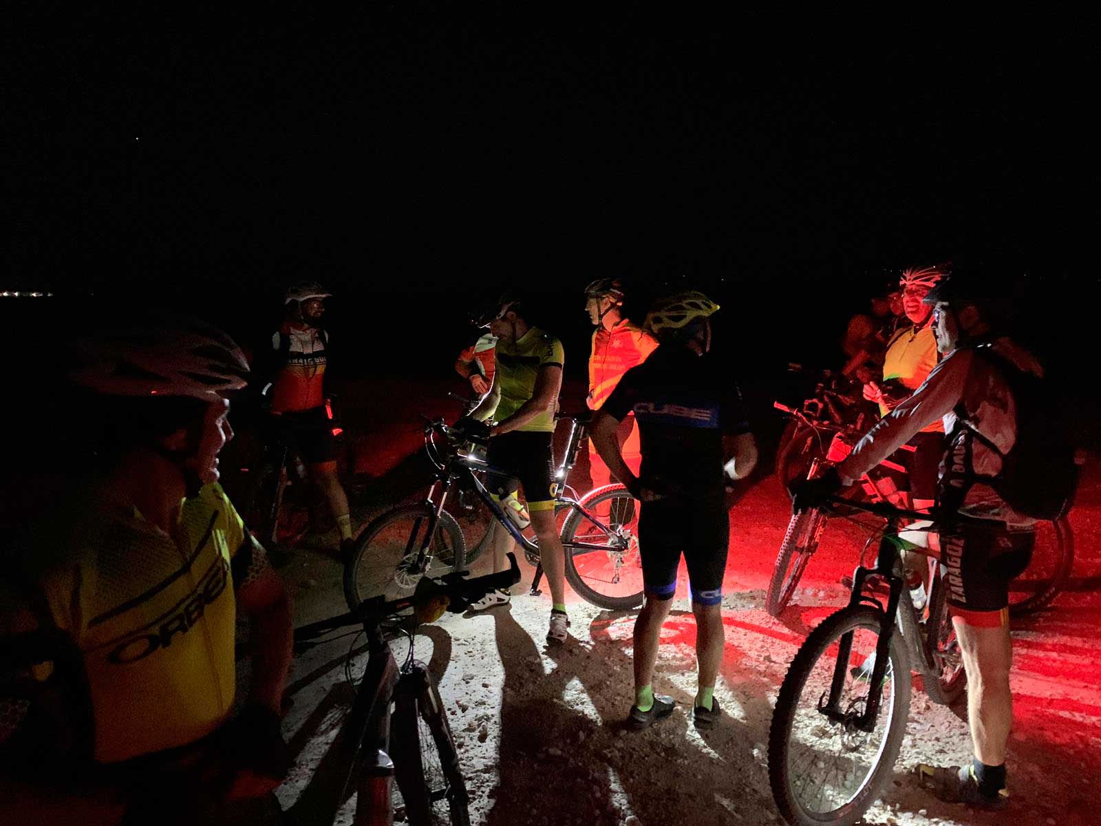 Nos pusimos a pedalear de nuevo , esta vez guiados por el gran “Morata” que dijo conocer un camino que se nos haría más cómodo que la vuelta que teníamos planeada. Iniciamos un descenso vertiginoso, de cara la oscuridad absoluta, si bien era fácil y sin ningún obstáculo pero siempre con ese respeto e imposición al que la noche te obliga, con los sentidos disparados y la adrenalina haciendo bailar tu pulso. Nos llegamos a ese punto más allá del “tiro bola” camino de las planas , en donde una bifurcación avalada por un cartel de madera te indica la dirección al camino de la estepa o bien hacia el conocido Montañés, pero claro esta, nosotros dándole la espalda a estos destinos. De una forma rápida y cómoda nos llegamos a las inmediaciones del cementerio, tras reunirnos de nuevo decidimos tomar el carril bici , hacia la estación de policía, llegar al canal y tomarnos algo en el bar “Imperial” ese emplazamiento tan bonito a la vera de un embarcadero y de un parque infantil. Tras unas cervezas, como mandan los cánones y una ronda de chistes, fotos y algo más , nos despedimos para la próxima ocasión, contentos , como niños que han realizado una aventura, valientes y aguerridos.