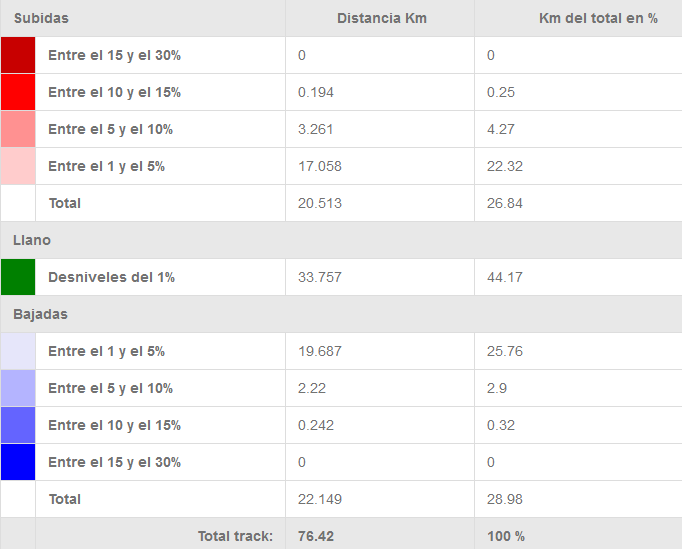 - Duración prevista: A una velocidad media de 20.5 km/h tiene un tiempo estimado de 03:40 horas + el tiempo de la duración de las diversas paradas que se realicen.