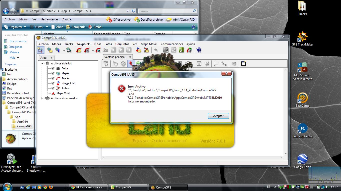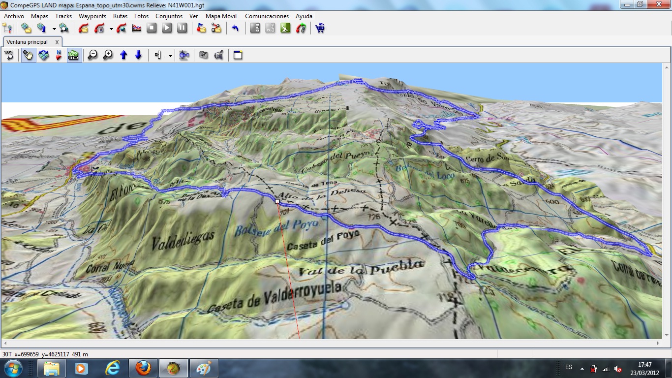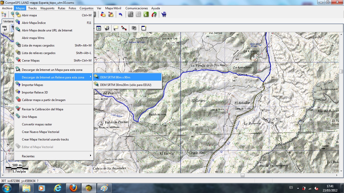 Vamos a ver en 3D. Nos vamos a Mapas, pinchamos en "Descargar de Internet un relieve para esta zona" y después en "DEM STRM 90m X 90M", nos descargará de internet los relieves en un fichero que por defecto se llamará algo así como "N41W001.hgt" y le diremos que lo guarde en la carpeta MAPAS (la próxima vez que lo necesitemos, ya no tendremos que descargarlo, lo abriremos como un mapa más pero teniendo habilitada la pestaña Relieves 3D).