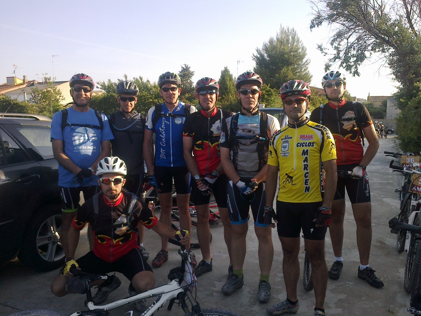 A David, Jorge y Ángel ya no les vimos el pelo hasta meta y el resto nos quedamos atrás. Ya en la primera subida de Perdiguera nos juntamos Fran, Fernando y yo, y en el descenso perdimos a Fernando de vista. Ahí comprobamos que ibas muy fuerte campeón. Más tarde pasaría Fran al cual alcancé al pie de la segunda subida de Farlete, también conocida y muy bonita cada cual fuimos subiendo con un grupete y cuál fue la sorpresa que en el desvió (corta o larga) de repente me quedo solo, en plena bajada entre pinos y vegetación y con la sensación de: Me abre equivocado? Sigo bajando cuando de repente aparece Fran detrás mío con la misma sensación, entre pinos y un barranco espectacular continuamos, en estas que aparece un biker de cc monegros y nos comento que iba tocado (jodo petaca pues si llega a ir bien ¡!!!)en la tercera subida dura de verdad nos ponemos a su rueda Fran de descuelga y yo intento seguirle sin éxito y sin arriesgar porque ya las subidas no las conocíamos y no sabias si regular ,tirar o apretar los dientes ,era una sorpresa continua pensabas que estabas arriba y mas y mas y mas continuaba para arriba , a tener en cuenta que en los primeros 40km ya llevábamos tres subidones del carajo ,me quedo en tierra de nadie en esto un biker con los cuádriceps tocados ,me paro y le comento que ante la proximidad del 2 avituallamiento daría parte de lo que le pasaba para que fuesen a recogerlo y así lo hice ,en esto que llega Fran y más tarde J Mari y sin noticias de Angel G .