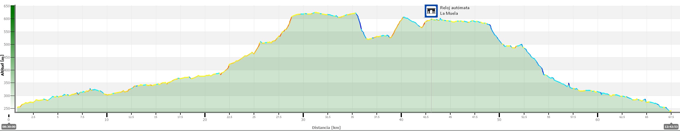 - Duración prevista: A una velocidad media de 16 km/h tiene un tiempo estimado de 04:12 horas + el tiempo de la duración de las diversas paradas que se realicen.