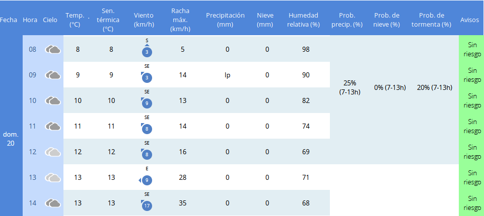 - Las previsiones según información elaborada por la Agencia Estatal de Meteorología son (clic en la imagen para visionar temperatura y velocidad-dirección del aire durante el recorrido).