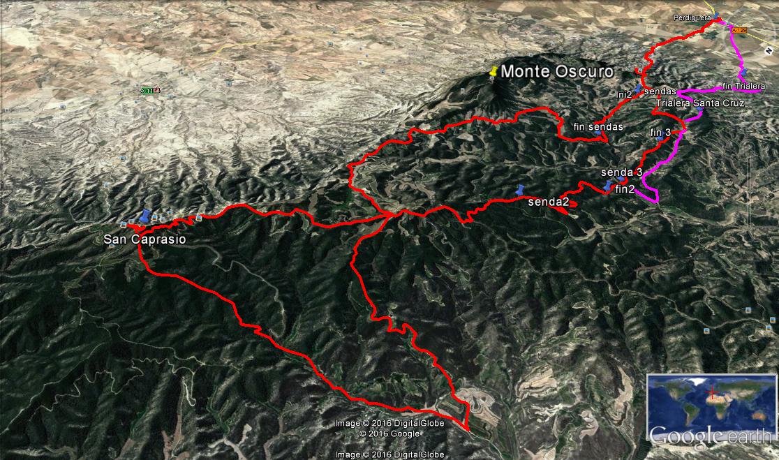 Saldremos del aparcamiento a la entrada de Perdiguera,; subida clásica por buena pista a "la sierra", primer tramo de sendas y nos desviamos hacia el sur de la sierra por el camino de Valdelasyeguas hasta llegar a un cruce de caminos al que volveremos de regreso. Primero tomaremos el camino de la derecha ya en subida a San Caprasio (parada para avituallamiento y fotos). La bajada por el barranco (pista) de San Caprasio (salvo que por tiempo hiciéramos la vuelta x el mismo camino)). Vuelta por el Catalán al cruce de caminos, y nueva senda en bajada hasta el collado del Navarro . Desde allí ya sube y baja de regreso. Al final hay una variante preparada por una trialera con rampas duras y escalones, para el que quiera un final feliz.....
