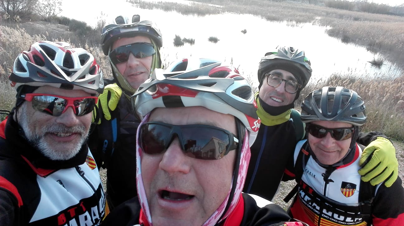 Llegamos a Alfocea y dirigimos nuestros manillares hacia esos caminos que enfilan a las colmenas, enseguida desviamos rumbo ya que nuestro destino estaba más allá, a punto para alcanzar aquella bonita alameda. Una zona que se propiciaba verde en la mayoría de sus partes pero que también dejaba entrever los estragos del crudo invierno, mostrando ramas desnudas, desprovistas de sus hojas. El piso se ofrecía de nuevo embarrado en algunos puntos, durante el trayecto , en algunas partes, un buen montón de ramas muertas y caídas, tronchadas y rotas que crujían al pasar sobre ellas con nuestras ruedas, incluso algunas que convino evitar dado su tamaño. En el lugar la foto de grupo que siempre hacemos, una pequeña parada para reponer fuerzas e iniciamos el regreso.