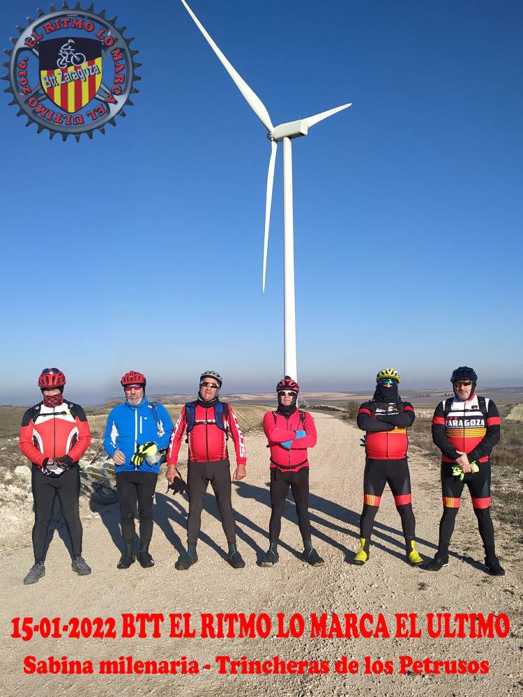 El sol comenzó a hacerse notar, pero era una acción estéril. Un astro sin apenas fuerzas, con más buena voluntad que ganas y que sólo consiguió subir los termómetros un par de vergonzosos grados. Allí el terreno comenzó a mostrarse ascendente. Tampoco eran unas cuestas de morir, pero después de estas vacaciones Navideñas, de todo el turrón y de todo el tiempo que hemos estado vagueando cualquier cosilla se hace un mundo. Enseguida llegamos a la sabina. Hicimos una breve parada en la que , sorpresivamente , nuestro número se elevó en uno. Se nos unió Pepe, un hobre con el maillot de BTTZaragoza y que se conocía la zona al dedillo. Nos comentó que andaba saliendo esporádicamente con uno y otro grupo. Que se apuntó a una salida con el nuestro pero claro, fue justo cuando empezó lo de la pandémia y ya sabemos lo que ocurrió.