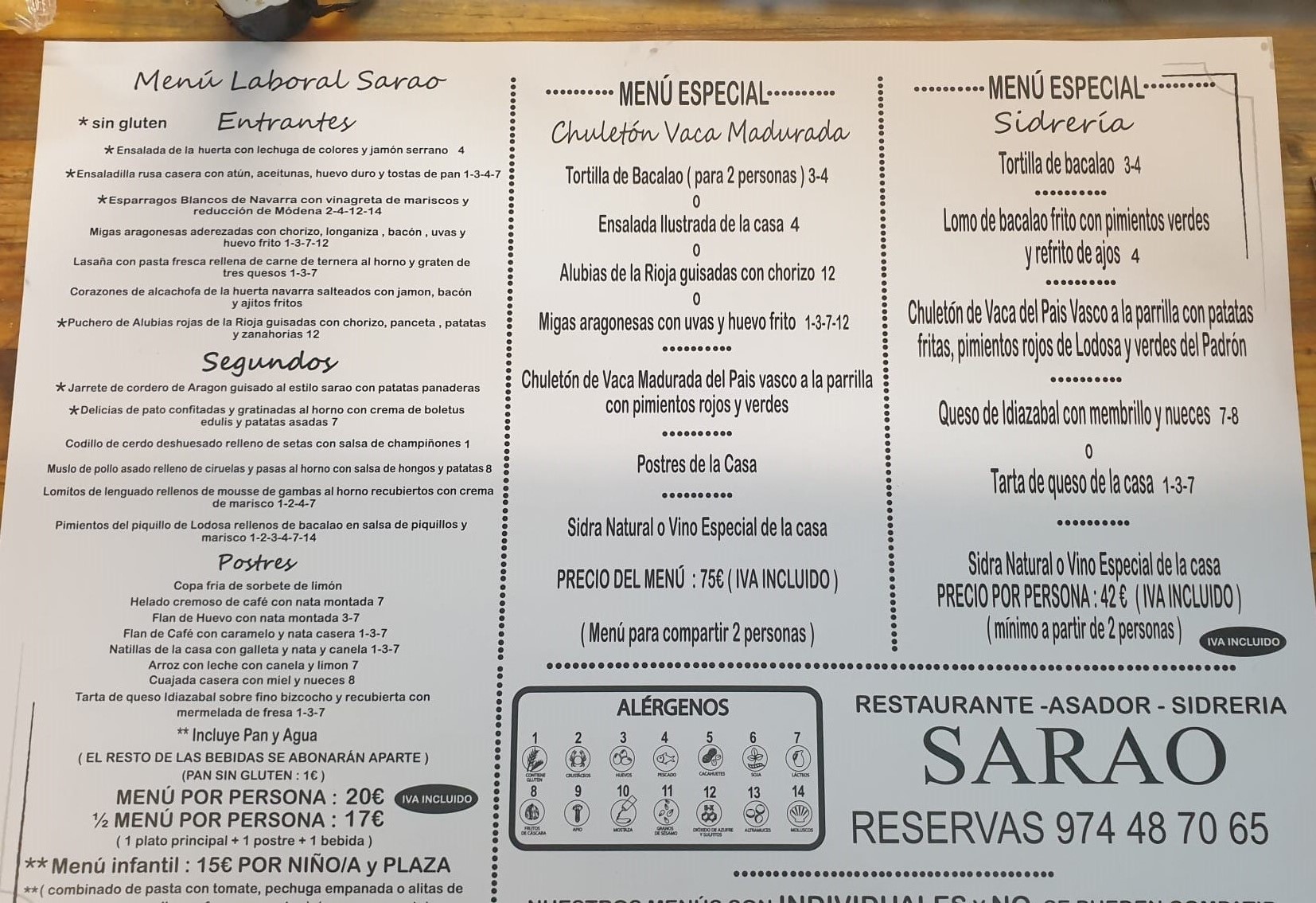 la comida sera es escarrilla RESTAURANTE SARAO comida de menu precio 20 euros en principio bebida agua y vino de la casa .resto se paga aparte .