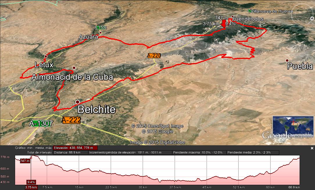 , con una subida sostenida pero con mucha piedra, y un tramo de bajada tambien pedregoso y con pendiente . De alli en bajada hacia el valle del rio Agua vivas, desde Azuara a Belchite que tenia ganas de conocer. Luego ya subida relativamente comoda de vuelta a Fuendetodos