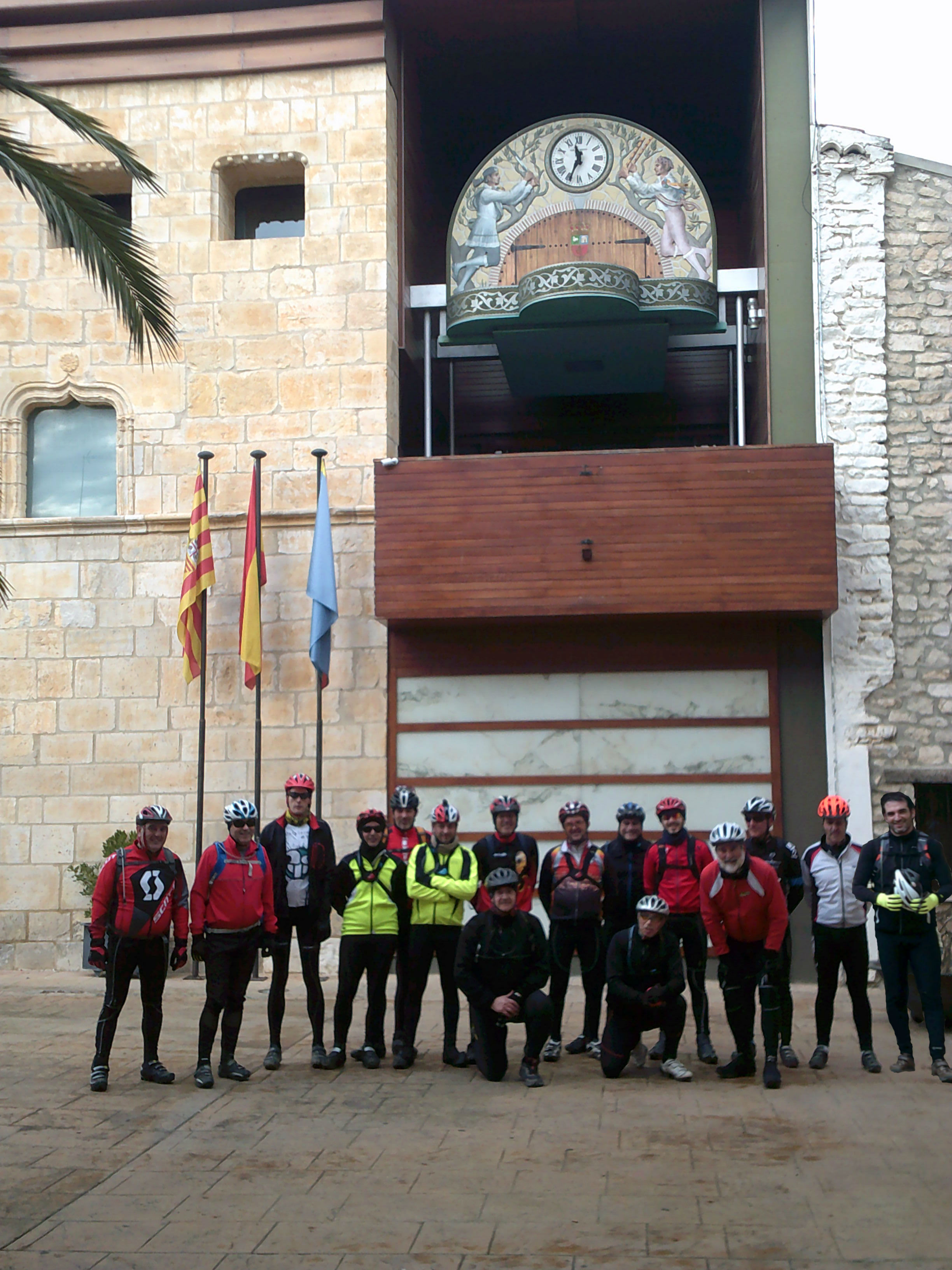 ). Continuamos rodando hasta llegar a las eses por arriba, ahy decicdimos bajar por pista a buena velocidad, rodear las eses para tomarlas de cara y subir otra vez al mismo punto. Una subida que me ha gustado bastante. A la cima llegan Albertolo y Zizou, seguidos a varios segundos por Juanjo y Didi y poco detrás aparecen Onacon y Pablo y así, en solitario uno y otro y otro compañero hasta llegar los dieciseis. Allí bocata, fotos, risas y para abajo. LLegamos a La Muela , paramos en la plaza para echarnos otra foto debajo del reloj de cuco y ya para Zaragoza por pista forestal. Llegamos a Cazadores y bajamos a buen ritmo evitando las regachas producidas por el agua.Esperando a reagruparnos, vemos que varios compañeros tardan en bajar y al llegar a nuestra altura nos comentan que Zizou ha caído por culpa de una regacha pero sin aparentes consecuencias sólo chapa y pintura. Abajo unos tomamos un barranco un poco dañado por el agua y otros bajan por la pista, pero acabamos todos juntos y ya camino de casa a la altura de Centrovía el track nos vuelve un poco locos por los labrados de los campos, pero tras un periodo de I+D