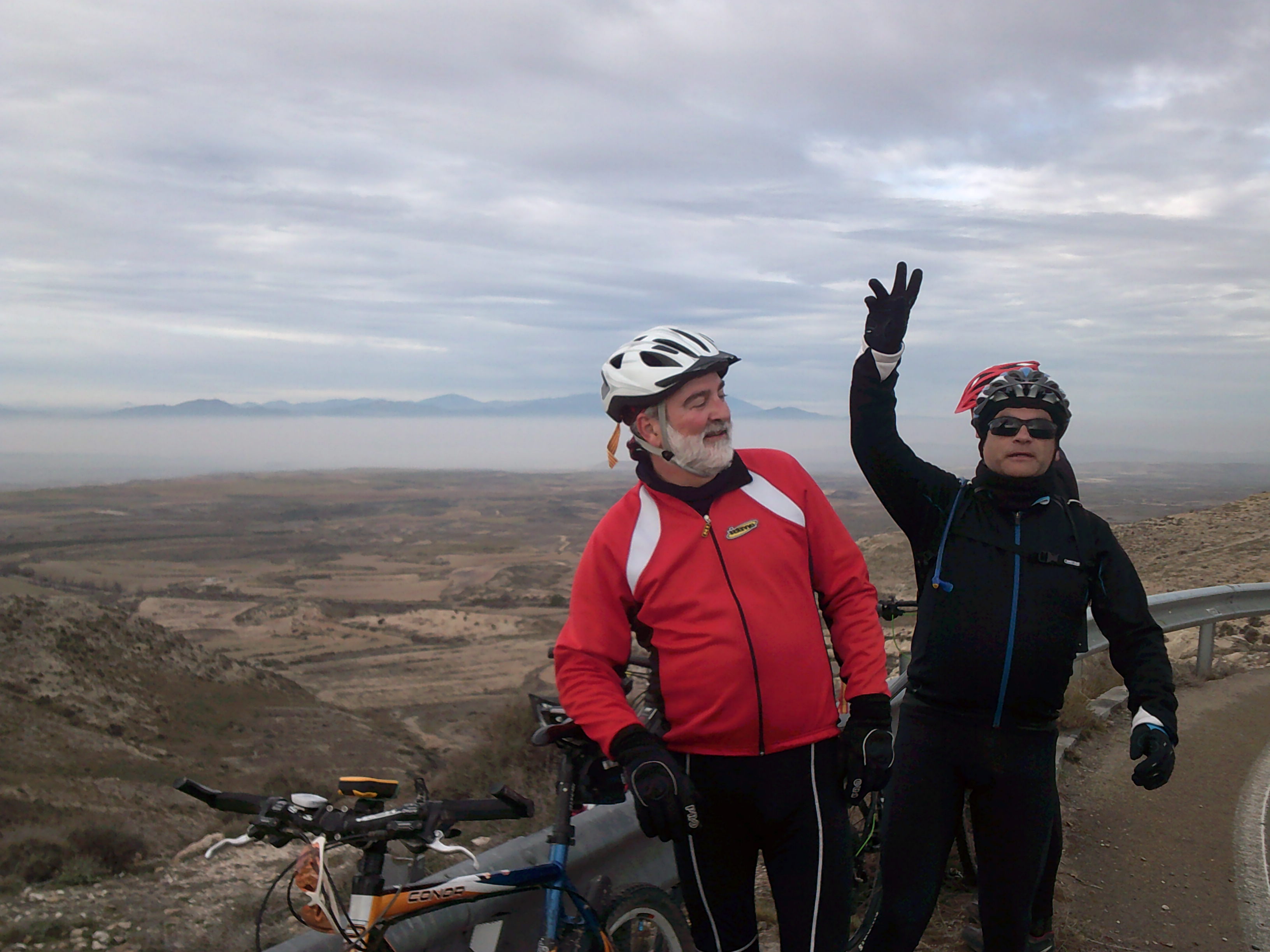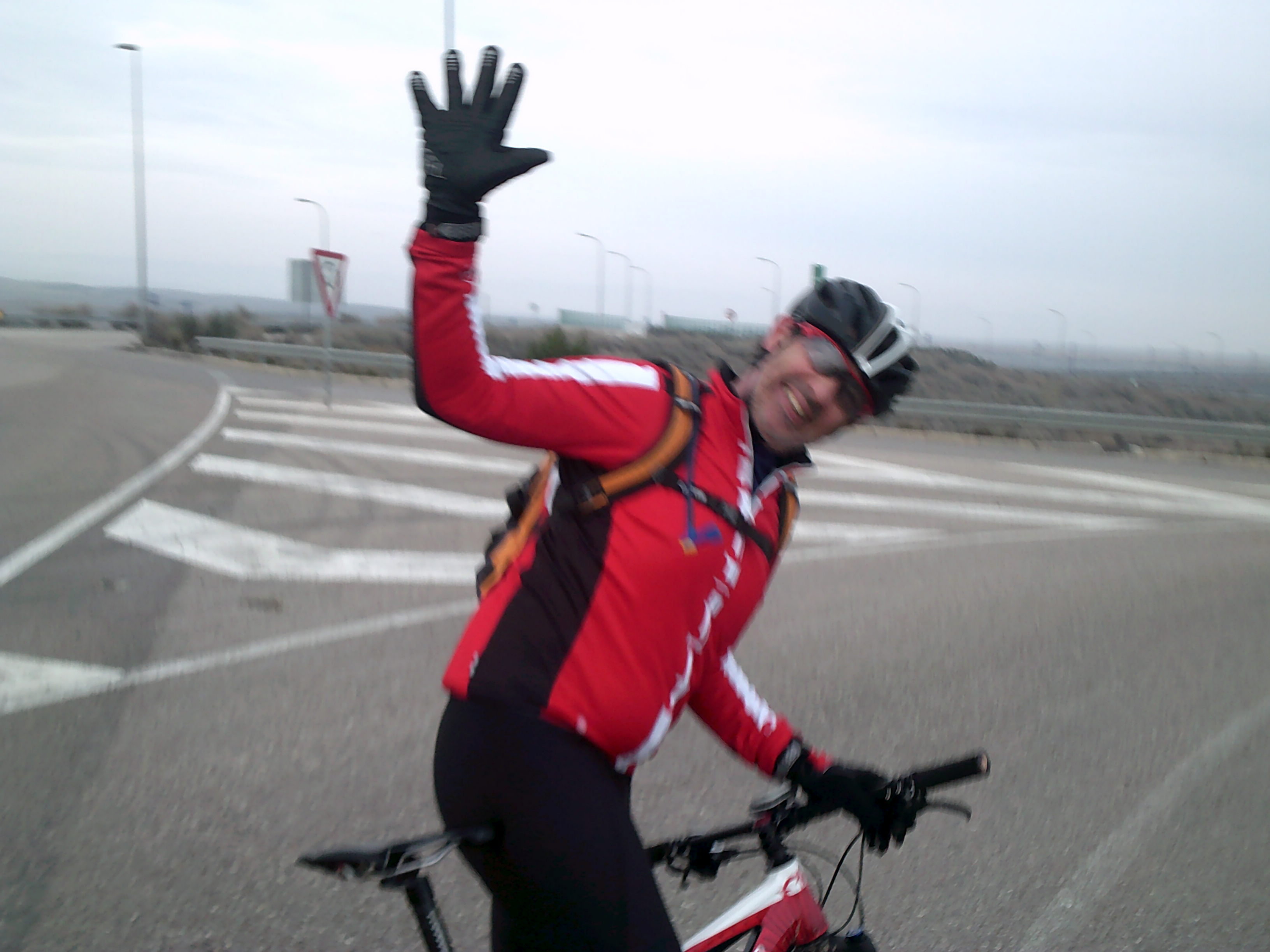 y en la que ya, nos encontramos arriba junto a varios molinos del parque eólico de La Muela. Allí hacemos un kit kat y echamos unos geles y unas risas. Sergio se sube en el caballo de Luisete y prueba el ciclo durante un rato ( la conor se va a jubilar pronto me da a mi Sergio