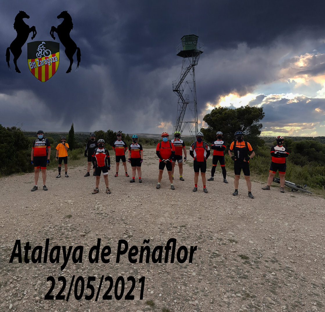 Nos salimos hacia el barrio del Comercio, pasamos por Villanueva y continuamos hacia la carretera A-1106 ( carretera de Leciñena). Tras pedalear un tramo por dicha carretera, nos desviamos hacia el vedado de Peñaflor. Subimos a la atalaya. Toca descansar, hacemos foto de grupo y TIK TOK