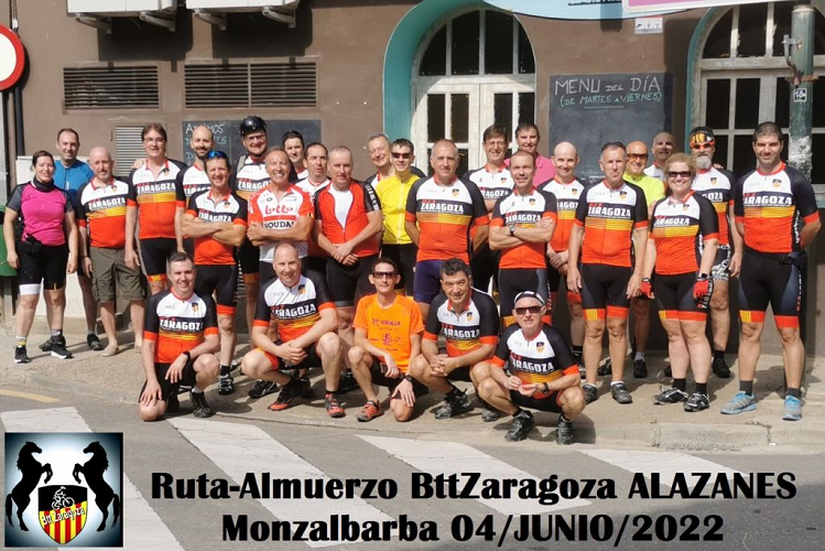 El lugar elegido, un acierto: Restaurante “Mi Familia” en Monzalbarba, o Almorzarbarba como en su día y en una de nuestras afamadas rutas gastronómicas lo renombró nuestro querido cowboy particular. Comedor cerrado exclusivo para nosotros, bicis dentro y a buen recaudo, trato amable y exquisito, preparación y reparto de las viandas y bebidas con soltura, presteza y diligencia, platos bien colmados de huevos, patatas panaderas y suculenta dosis de grasas porcinas. Todo ello montado cómodamente en tres mesas de diez comensales por cada una que hacen un total de... ... No hay que ser de ciencias puras para acertar la cifra total de asistentes, pero a mí me faltan dedos. Será que más bien soy de letras.
